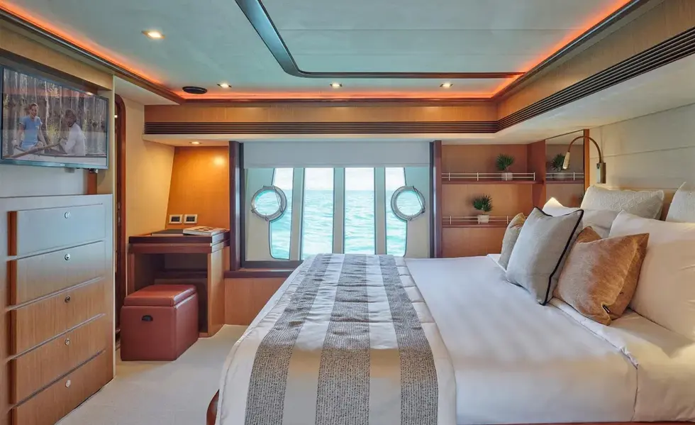 The interior of 2006 Ferretti 731 offers a sophisticated and functional space. The salon, complete with a Bose sound system and satellite TV, provides a central hub for relaxation. The well-equipped galley features modern appliances for all culinary needs. Below deck, four en-suite cabins, including a full-beam master and VIP, provide luxurious accommodation for up to eight guests, alongside separate crew quarters.