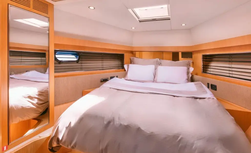 The interior layout is thoughtfully designed to accommodate up to six guests in three luxurious cabins, each featuring its own ensuite bathroom. The master suite, VIP stateroom, and guest cabin are all adorned with high-quality materials, including stainless steel accents and fine leather upholstery, creating an ambiance of refined elegance.